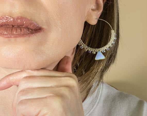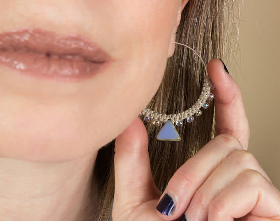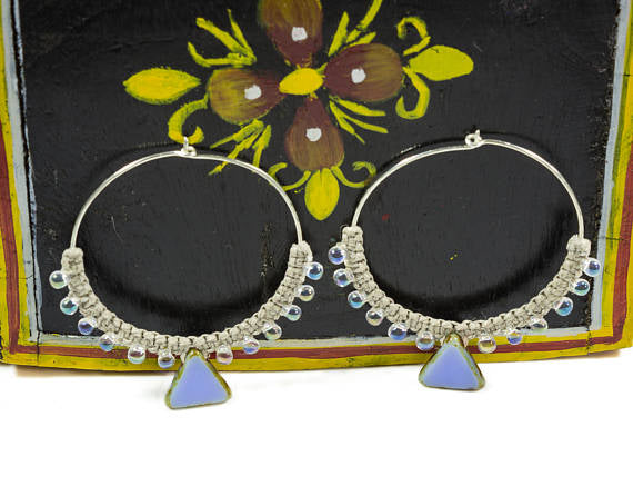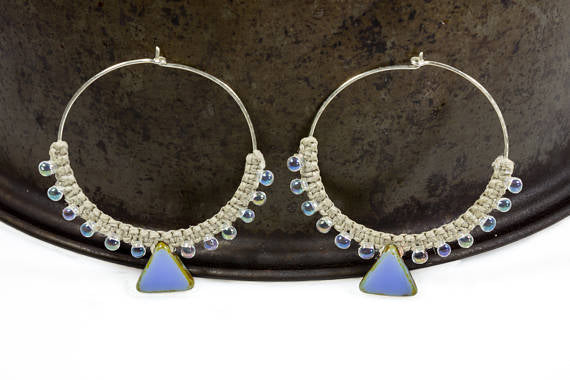 Sterling silver hoop earrings embellished with beautiful fringe crystal beads and hemp cording. A periwinkle blue triangle bead dangles below for the perfect finishing touch! These macrame earrings are very elegant but also look great with a pair of jeans. Lightweight, comfortable and so unique...You'll just love these beaded hoop earrings!