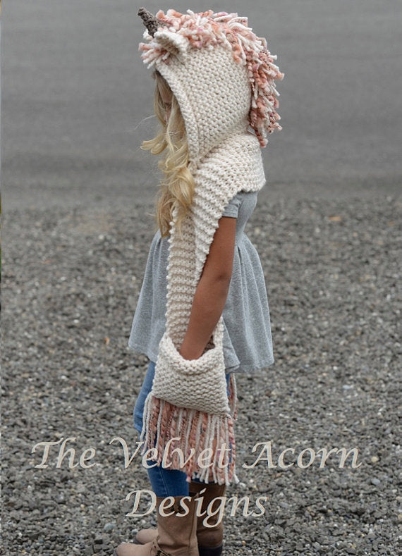 This is a listing for "The PATTERN ONLY for The Unice Unicorn Hooded Scarf" This unicorn hooded scarf is handcrafted and designed with comfort and warmth in mind...this piece can be made with or with out the ears, horn and mane. It can be done as just a hooded scarf with or without the fringed bottom pockets if wanted. This hooded scarf make's a wonderful gift and of course also something great for you or your little one to wrap up in too. All patterns written in standard US terms. *Sizes are for 12/18 months, Toddler, Child, Teen, Adult *Super Bulky yarn used. ***You can always contact me if you have any problems with the pattern. I am happy to help if you have any questions along the way. ***There is no shipping charge for this item as it is a PDF file and will be sent out within 24 hours of payment. If you don't receive it within 24 hours, please, contact me. ***Price is for the PATTERN only, not the finished product. ***These patterns are copyright The Velvet Acorn © so PLEASE DO NOT COPY, SHARE, ADJUST OR RESELL MY PATTERN. I wrote and tested this pattern myself, from beginning to end. It took a lot of time and work, and I would really like to have it remain “my pattern.” If you have any questions with my patterns please feel free to contact me: thevelvetacorn@yahoo.com Thank you, HeidiMay